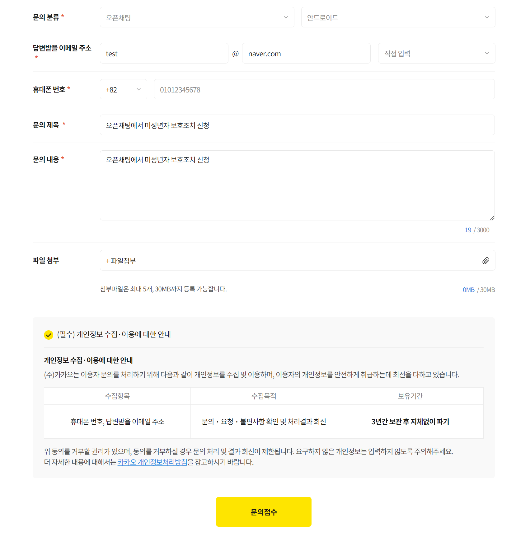 카카오톡 고객센터에 문의하기를 통해 미성년자 보호조치 접수를 할 수 있다.
