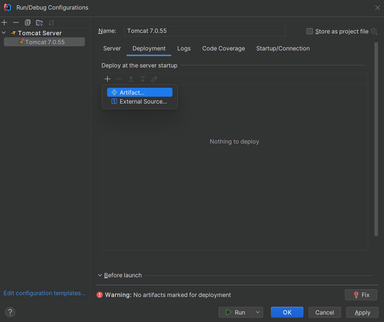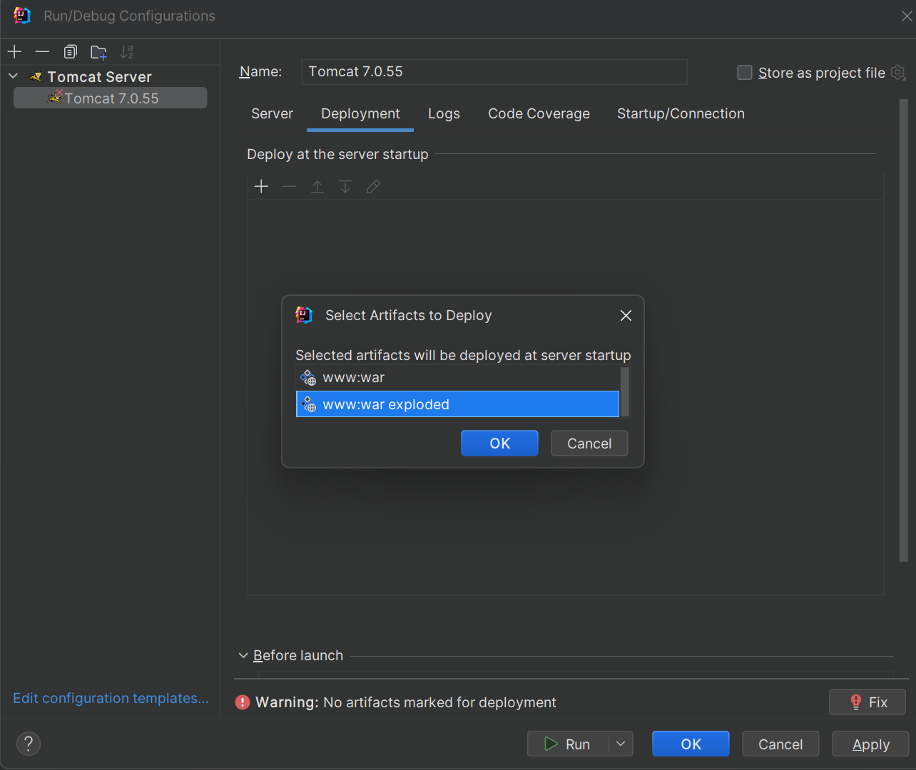 Deployment 탭으로 이동해 + 버튼을 누르고 artifacts.. 을 선택한 후 select Artifacts to Deploy 창에서 www:war exploded를 선택한 후 OK버튼을 누른다.