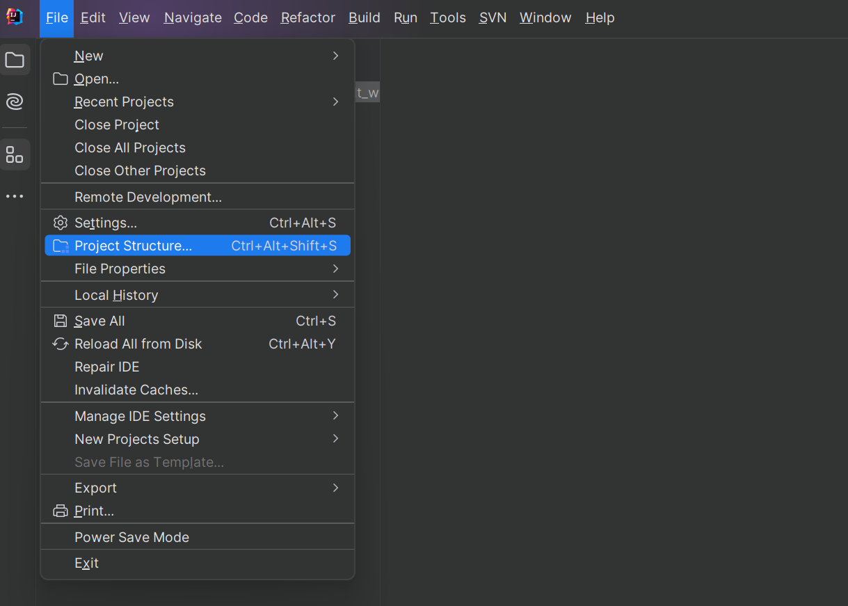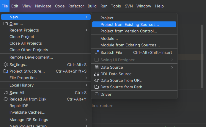 먼저 [File] -> [New] -> Project from Existiong Sources를 클릭한다.
