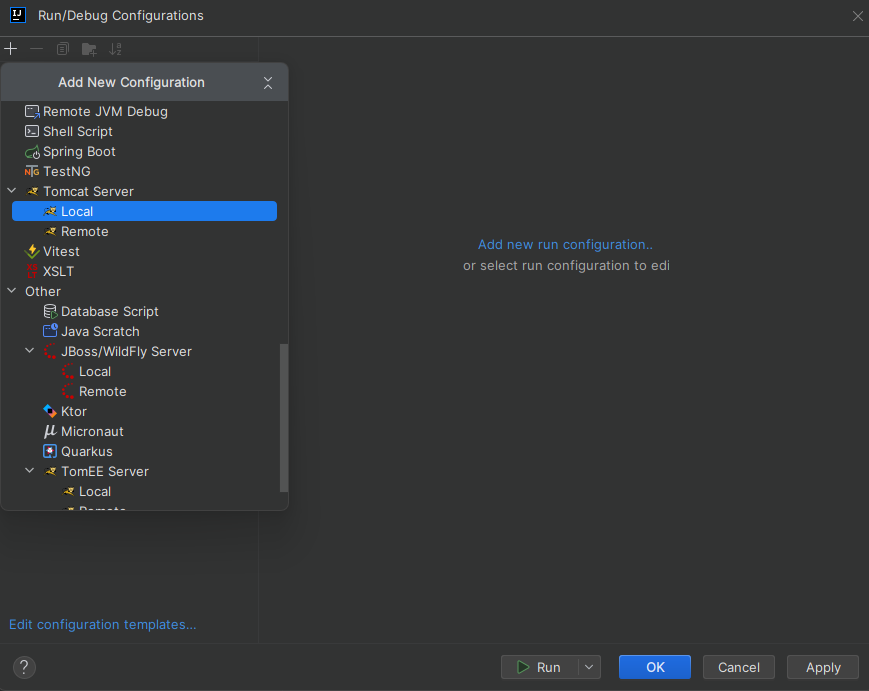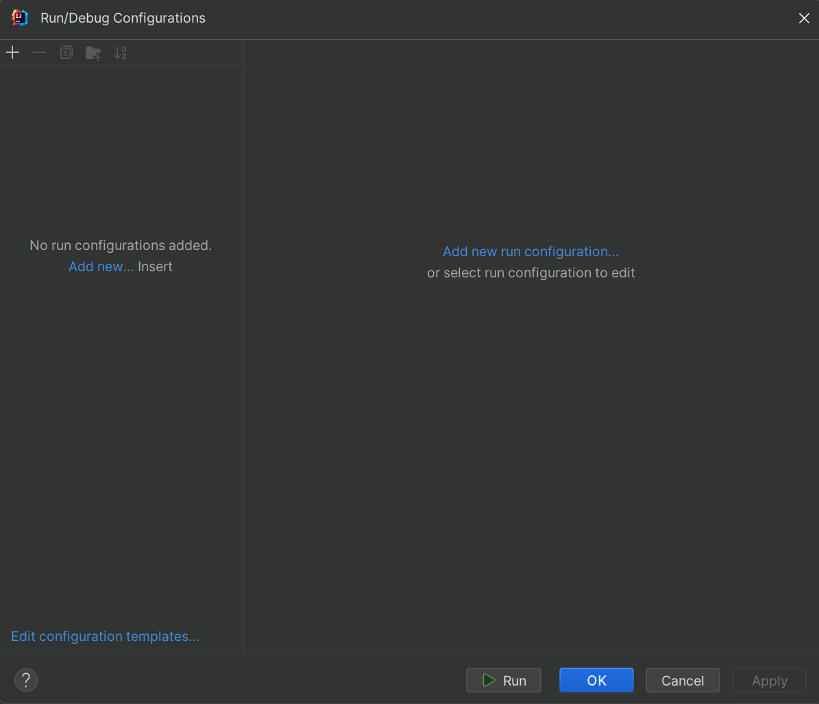 [Run] - Edit Configurations 메뉴를 클릭하고 + 버튼을 누른다.