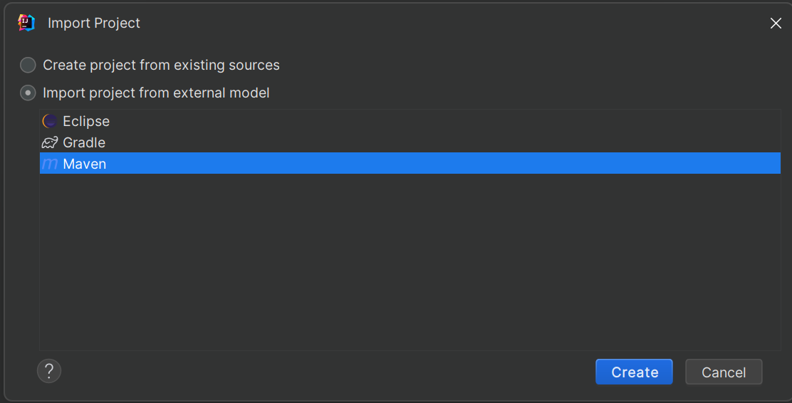 해당 프로젝트의 성격에 따라 Eclipse, Gradle, Maven을 선택한 후 Create 버튼을 클릭한다.