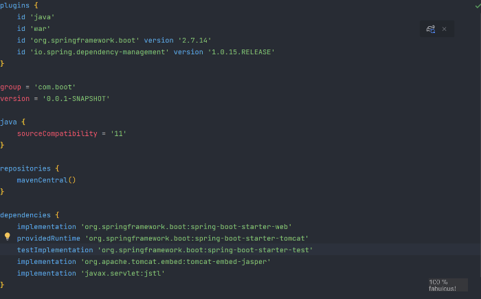 jsp 사용을 위해 build.gradle 파일에 톰캣 jasper 엔진과 jstl을 추가해 준다.