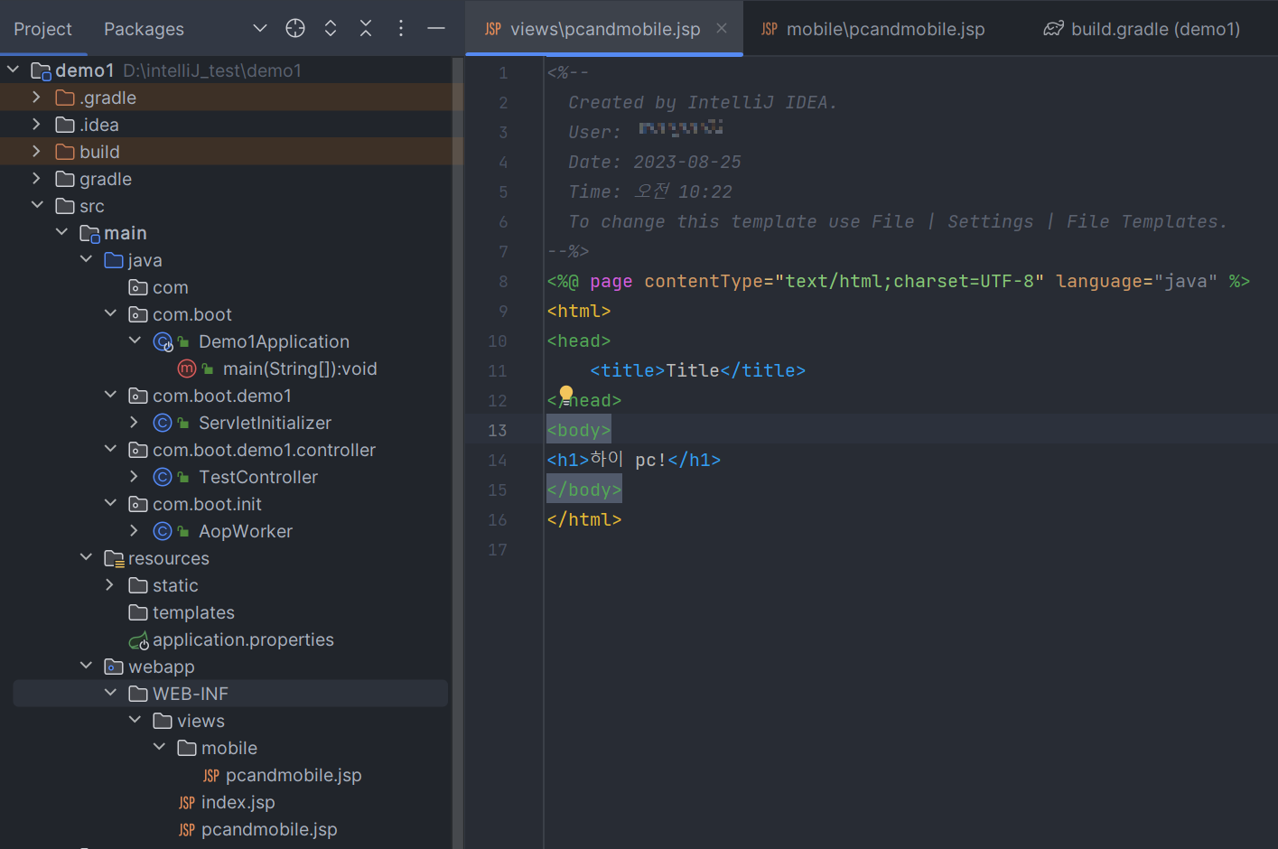 일반적으로 접근할 때는 views폴더 바로 아래에 있는 pcandmobile.jsp로 뷰페이지를 반환한다.
