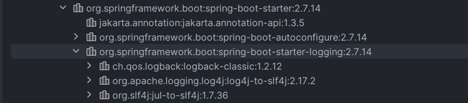 Gradle dependencies를 살펴보면 starter-logging안에 logback,log4j,slf4j가 포함되 있는 것을 확인 가능하다.