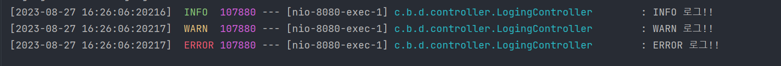 그런데 로그를 다섯 개를 찍었는데 WARN과 ERROR 로그는 찍히지 않았다.