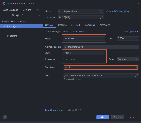 User에는 아이디를 Password에는 비밀번호를 입력하고 Database에는 데이터베이스명을 적어준다.