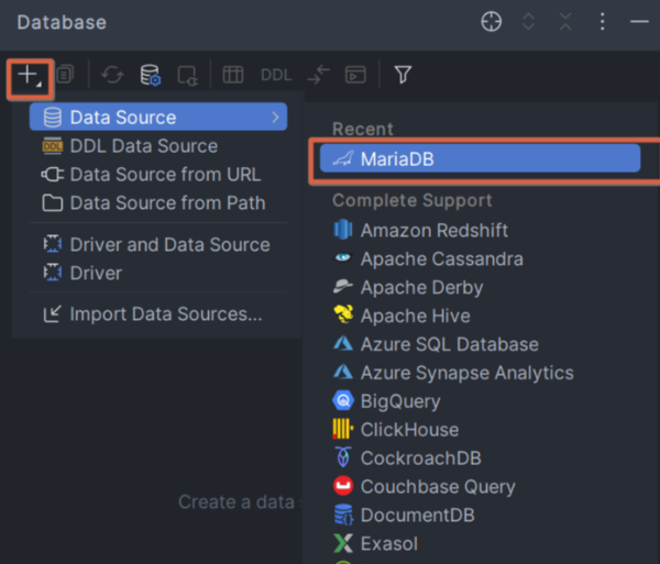 [+] 버튼을 누르고 데이터소스(Data Sorce)를 선택한 후 내가 사용하는 데이터베이스(database) 종류를 선택한다.