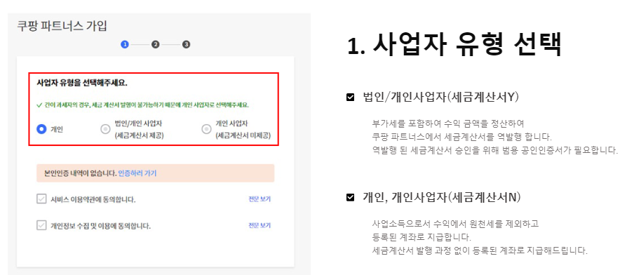 회원가입을 시작하면 사업자 유형을 선택하는데 개인사업자는 수익에서 원천징수세를 제외하고 계좌에 지급이 되고 법인사업자는 부가세를 포함하여 세금계산서를 역발행한다.