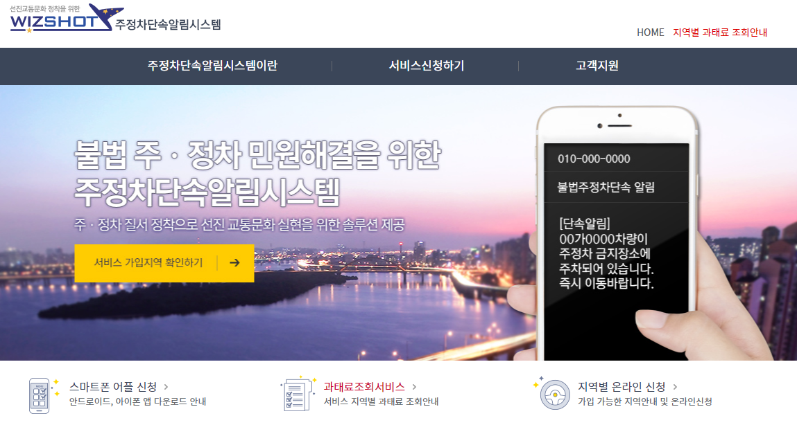 위즈샷 주정차단속알림시스템 사이트에 접속하면 조금이나마 편리하게 주정차 알림 서비스를 신청할 수 있다.