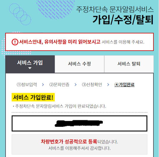 이미 신청을 했는데 핸드폰 번호나 차량번호가 바뀌었다면 서비스 수정을 눌러 개인정보를 수정해 주면 된다.