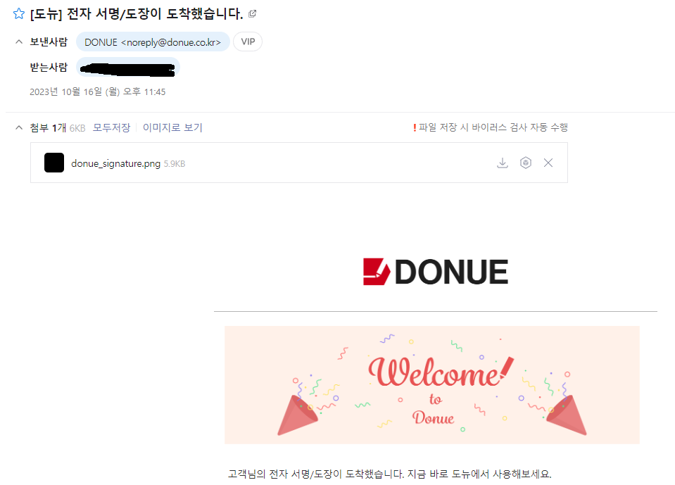 입력한 메일을 살펴보면 도뉴에서 보낸 전자 서명 이미지가 도착해 있는 것을 확인할 수 있다.