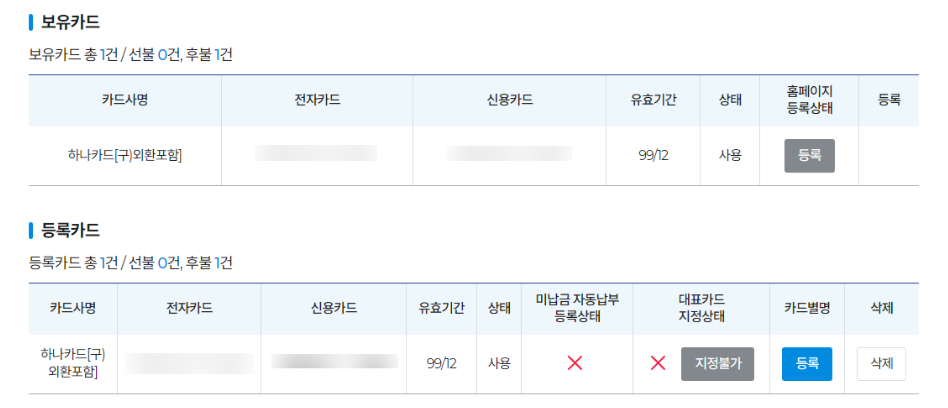 보유카드와 등록된 카드를 알수 있으며 필요 없는 카드의 경우 삭제도 가능하다.