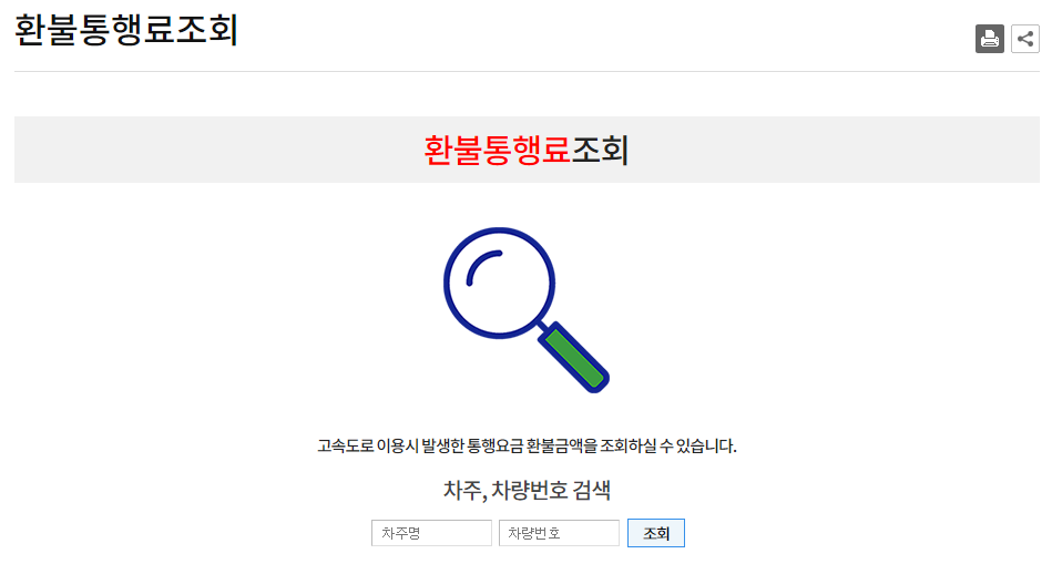 환불받을 통행가 있다면 환불통행료 조회 메뉴에서 차주명과 차량번호를 입력하면 쉽게 알 수 있다.