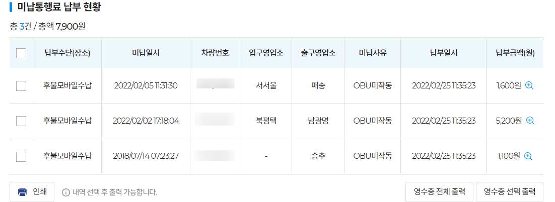 미납 통행료가 너무 많이 나온것 같다거나 각 요금소별 통행요금이 궁금하다면 홈페이지에서 조회가 가능하다.
