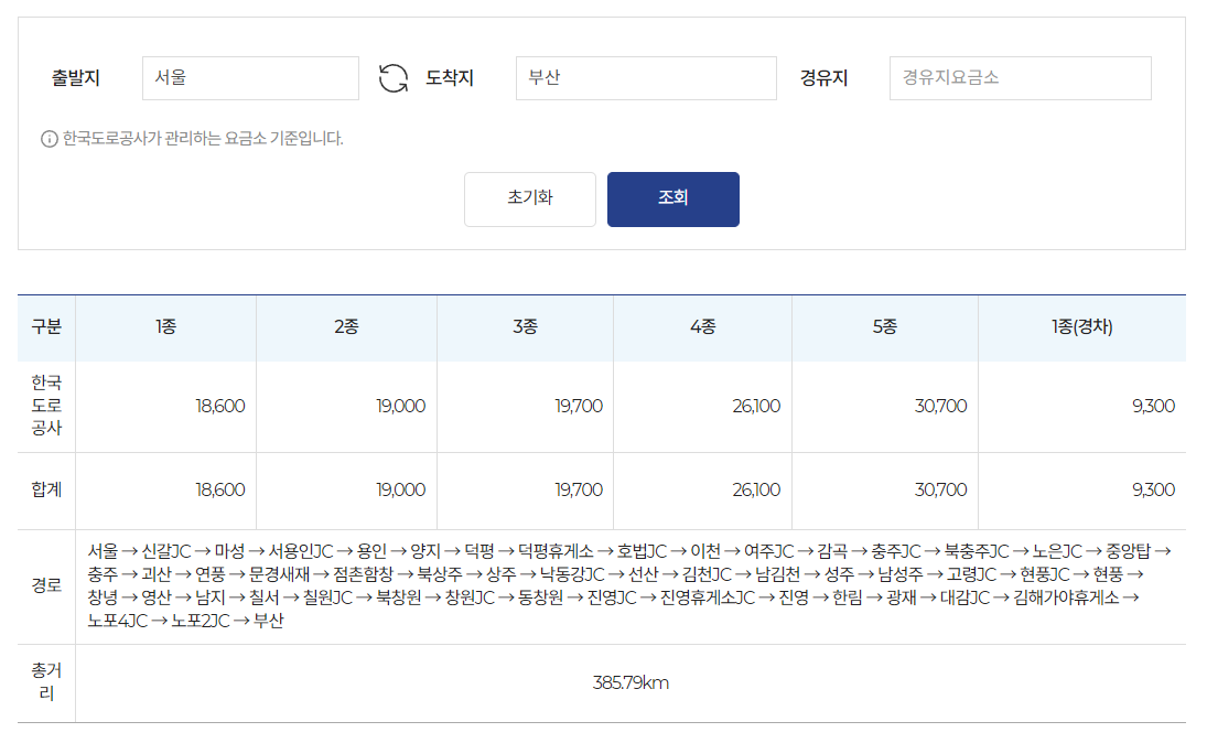예를 들어 서울에서 부산까지 경유지를 거치지 않고 통행을 한다면 통행료는 1종은 18,600원, 2종은 19,000원 부과된다.