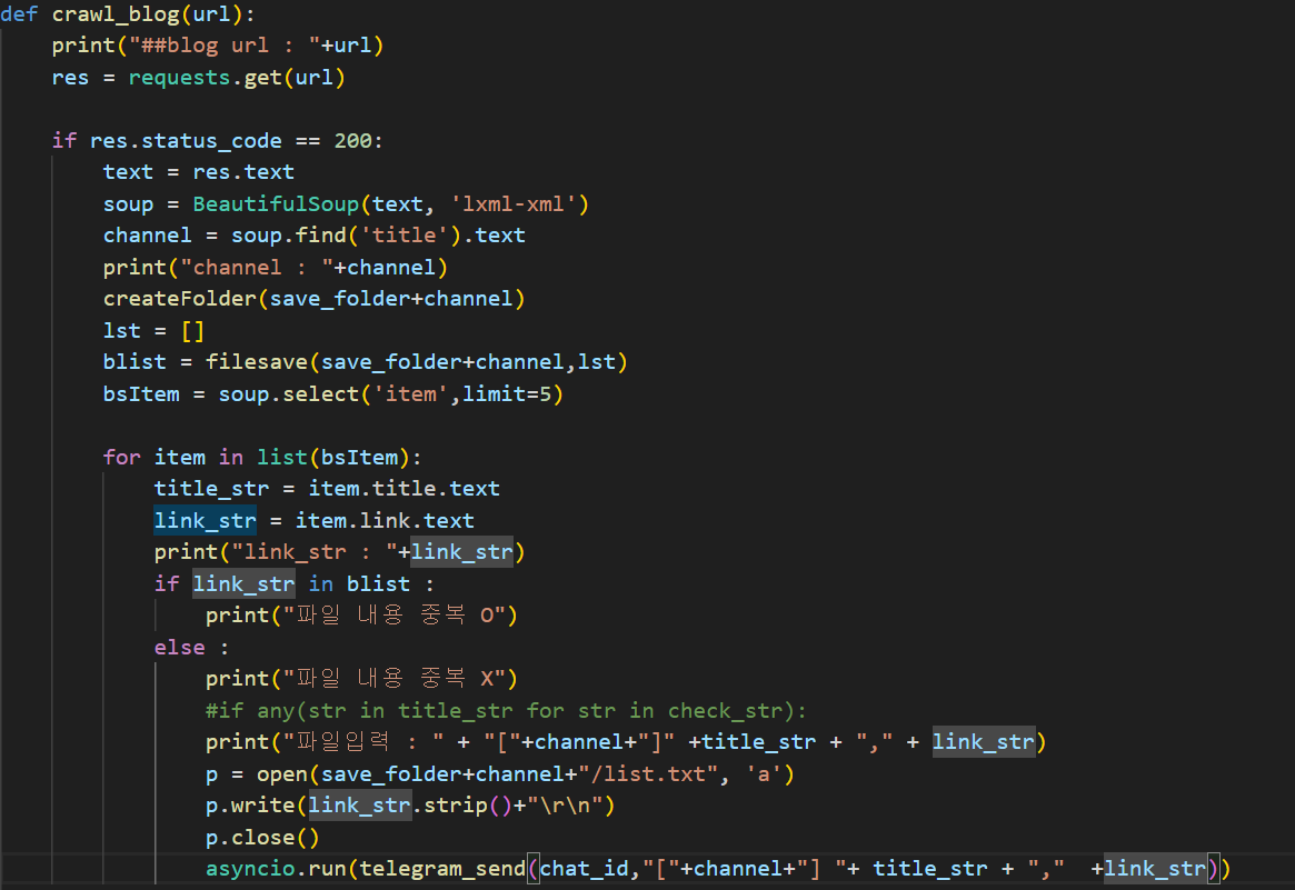 반복문을 만들고 블로그 주소를 매개변수로 전달받는 crawl_blog라는 메소드를 만들었다.