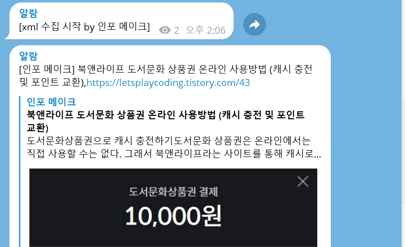 이렇게 해서 간단하게 xml을 읽어서 txt 파일에 저장하고 새로운 글일 경우 텔레그램 알람이 오게 만들어 보았다.
