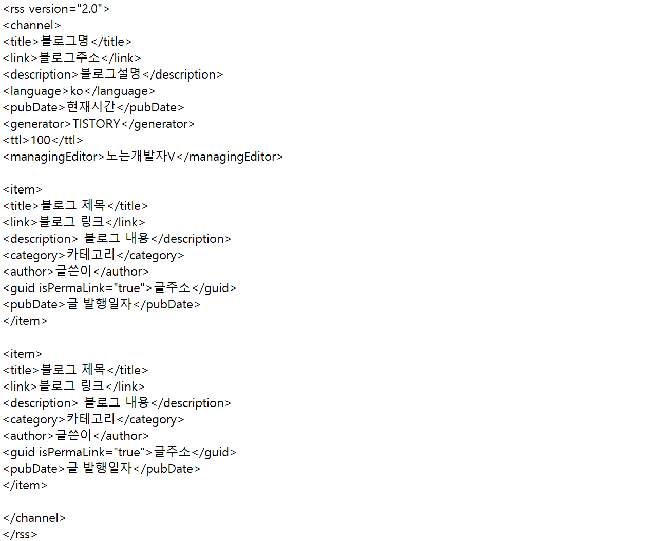 티스토리 rss를 살펴보면 rss/channel 안에 title(블로그명), link(블로그링크)가 있고 각각의 블로그 제목과 링크들이 들어있는 item이 반복됨을 알 수 있다.