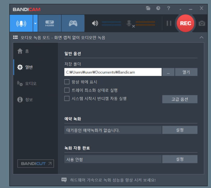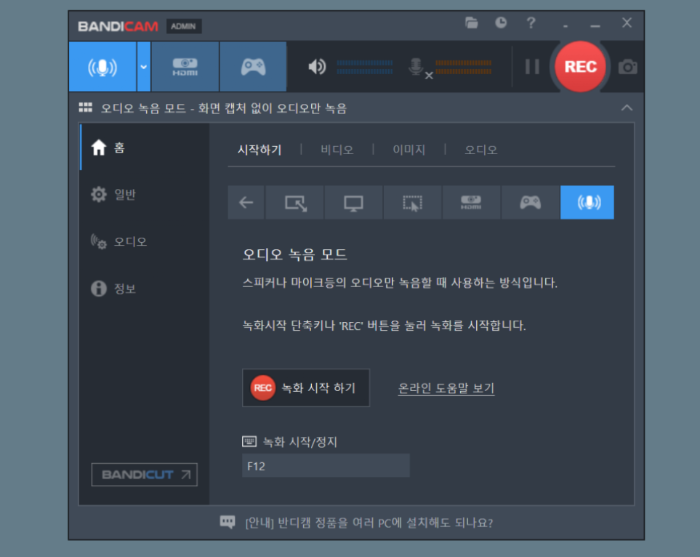화면 녹화는 하지 않고 오로지 컴퓨터소리나 마이크소리 등만 녹음할 때 쓰인다.