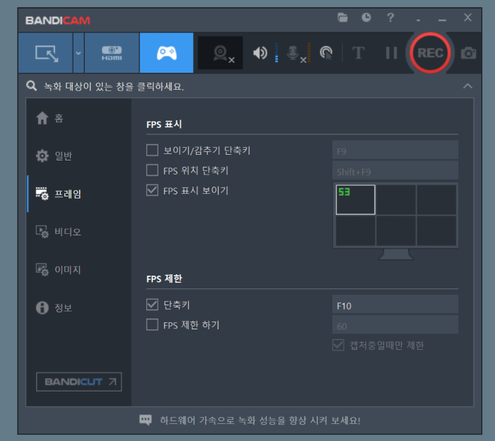 반디캠은 게임 녹화를 할때 프레임 기능도 제공한다.