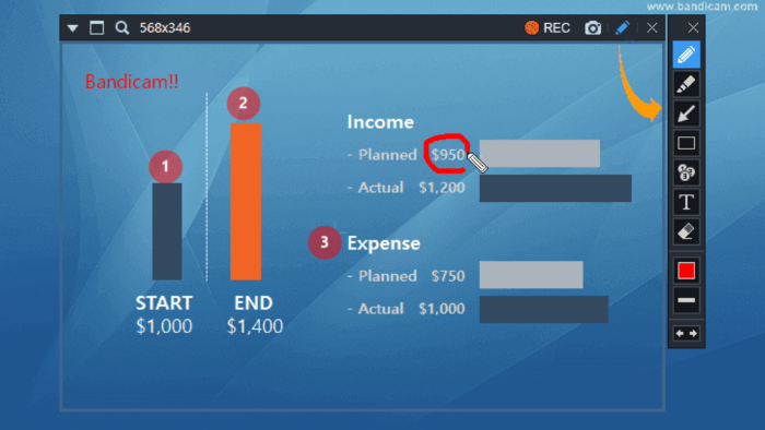 이용 가능한 기능은 펜,형광펜, 화살표, 사각형, 번호추가, 글씨 입력등이 있으며 웹캠이 있는 경우 웹캠화면도 녹화화면에 삽입할 수 있다.
