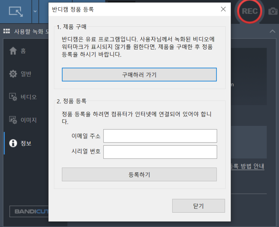 반디캠 무료 버전을 다운로드해 설치한 후 정품 등록 페이지에서 이메일 주소와 시리얼 번호를 입력하면 정품 등록이 완료된다.