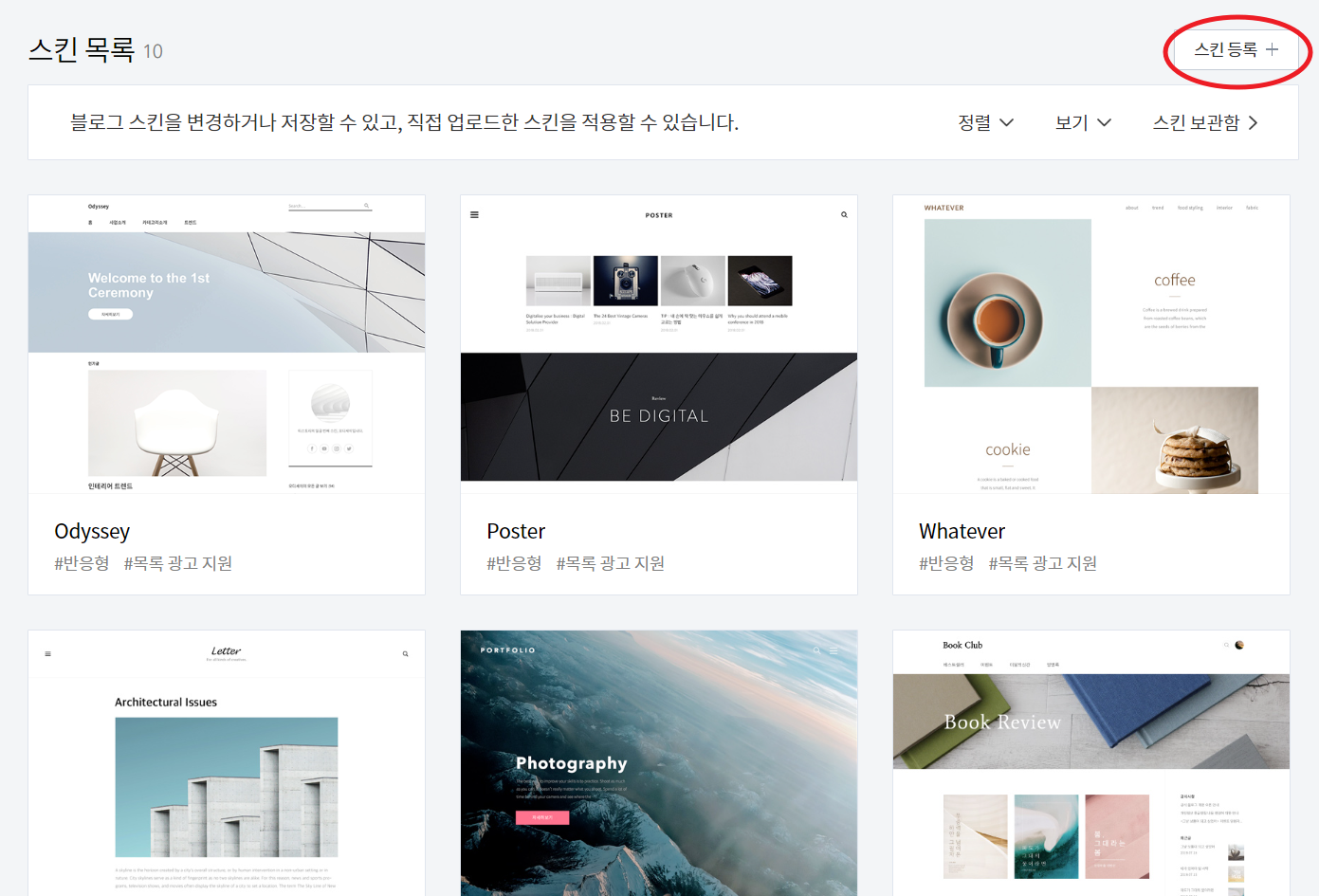 스킨을 적용하려면 목록 우측상단에 스킨등록+ 버튼을 누른다.
