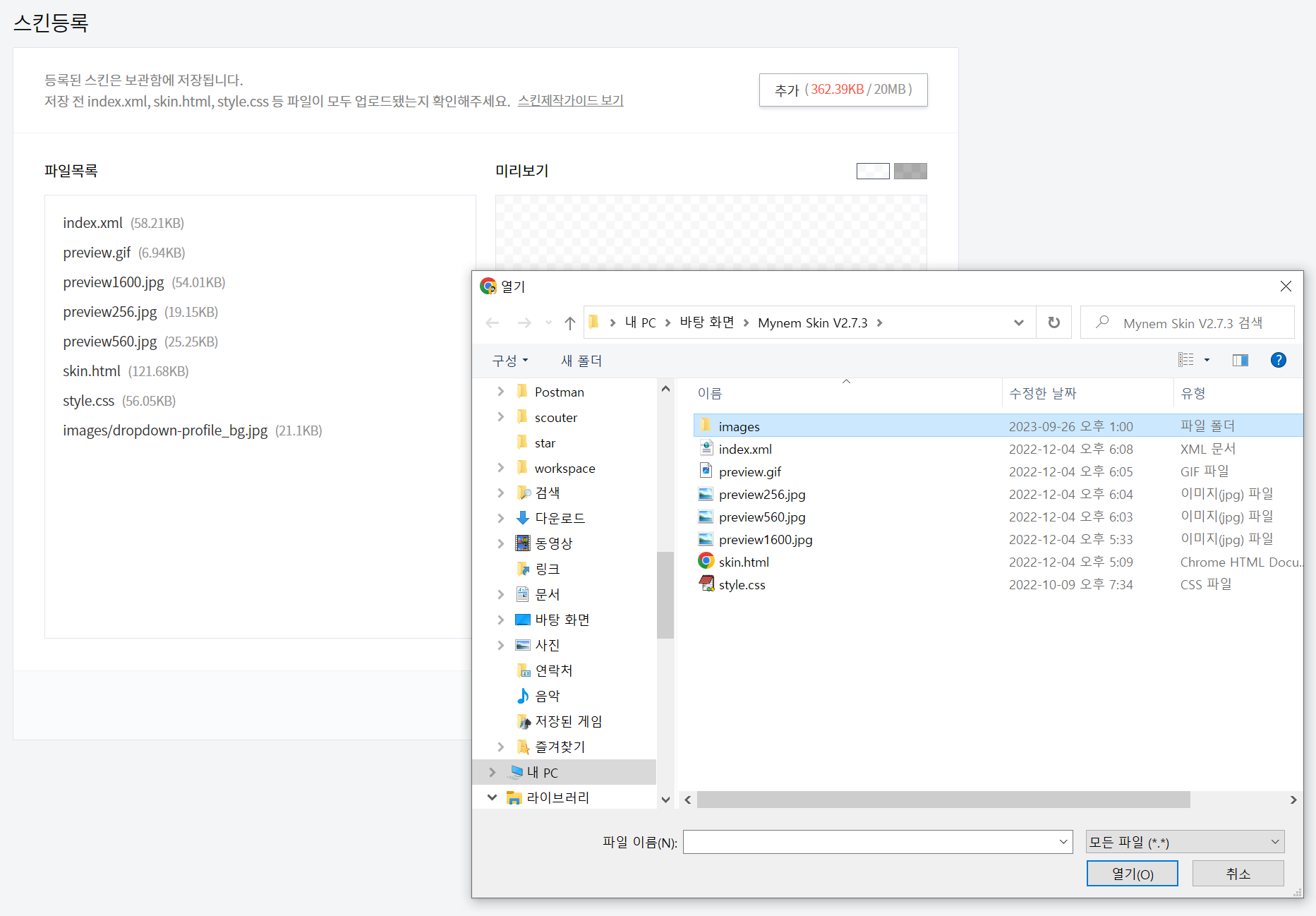 내가 받은 스킨 파일들을 전부 클릭해 파일목록에 나오도록 추가해 준다.