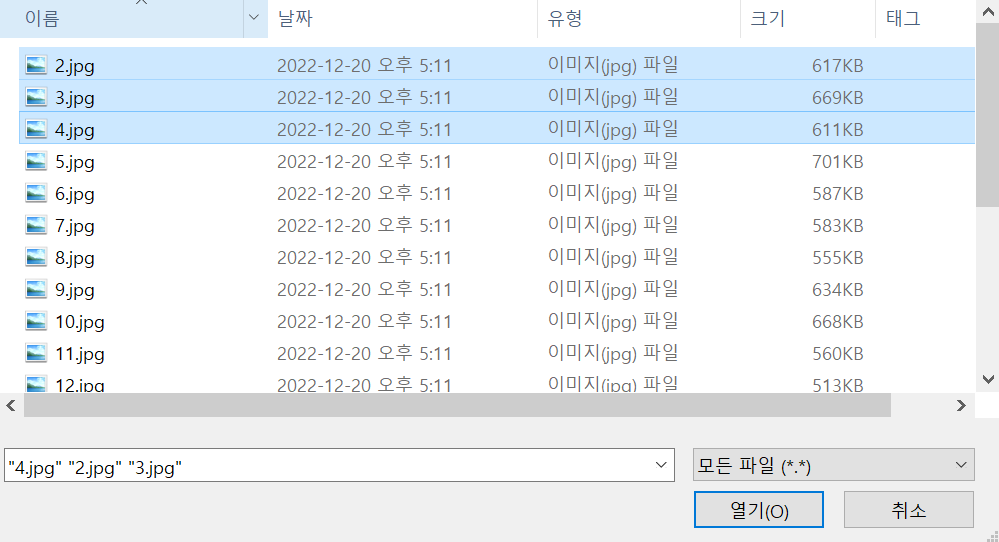 컨트롤키(Ctrl)를 누르고 사진을 선택하면 여러 개의 사진을 선택할 수 있다.
