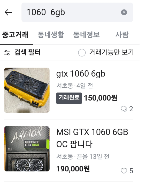 반대로 당근마켓에서 물건을 구매하려면 검색창에 제품명을 정확히 검색해 보면 된다.