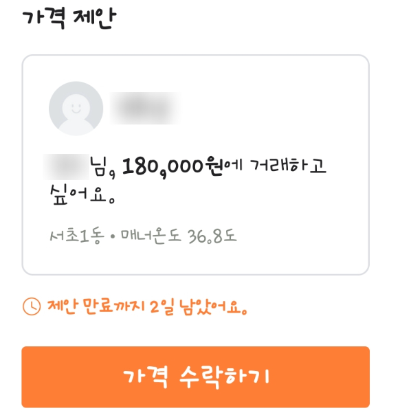 글을 올릴때에는 가격 제안받기에 체크를 하면 구매자가 직접 원하는 가격으로 제안이 온다.