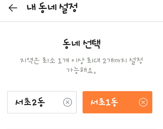 내 동네는 최소 1개 최대 2개만 설정이 가능하다.