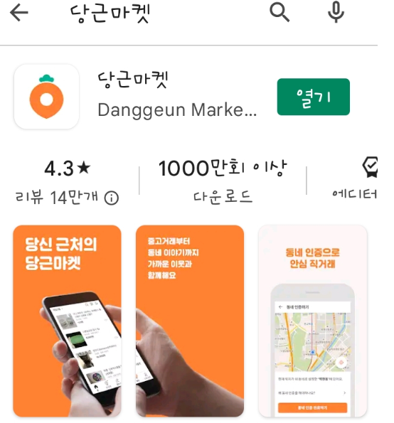 당근마켓앱의 평점은 4.3이며 다운로드수는 1000만회 이상이다.