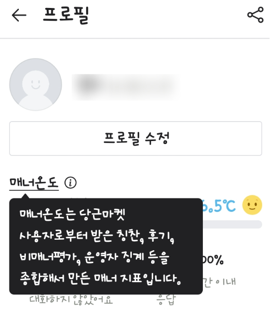 매너온도는 중고거래 시 다른 이용자로부터 받은 칭찬, 후기, 비매너평가등을 종합해서 만든 매너 지표이다.
