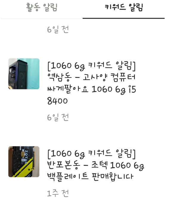 당근마켓에서는 내가 원하는 물품이 등록이 되면 알람을 해주는 키워드 알람서비스로 제공하고 있다.
