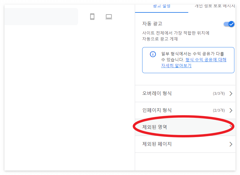 광고영역을 제외시키려면 먼저 광고설정에서 제외된 영역을 클릭한다.