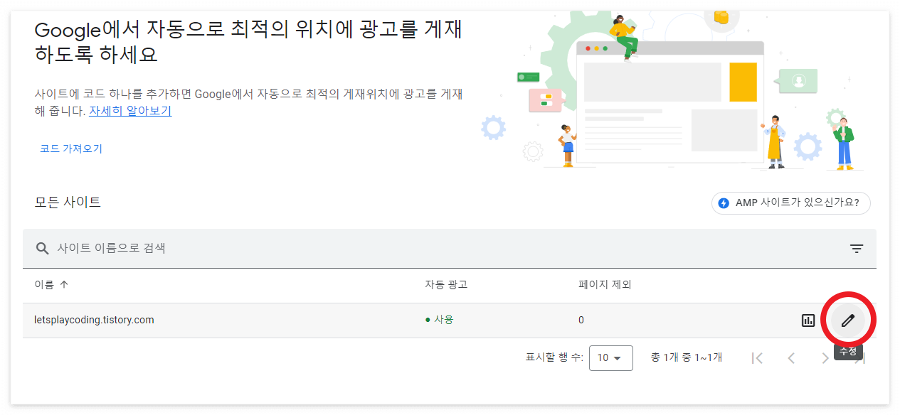 애드센스 사이트에 접속해 로그인을 한후 [광고] 탭에서 연필모양의 수정버튼을 클릭한다.