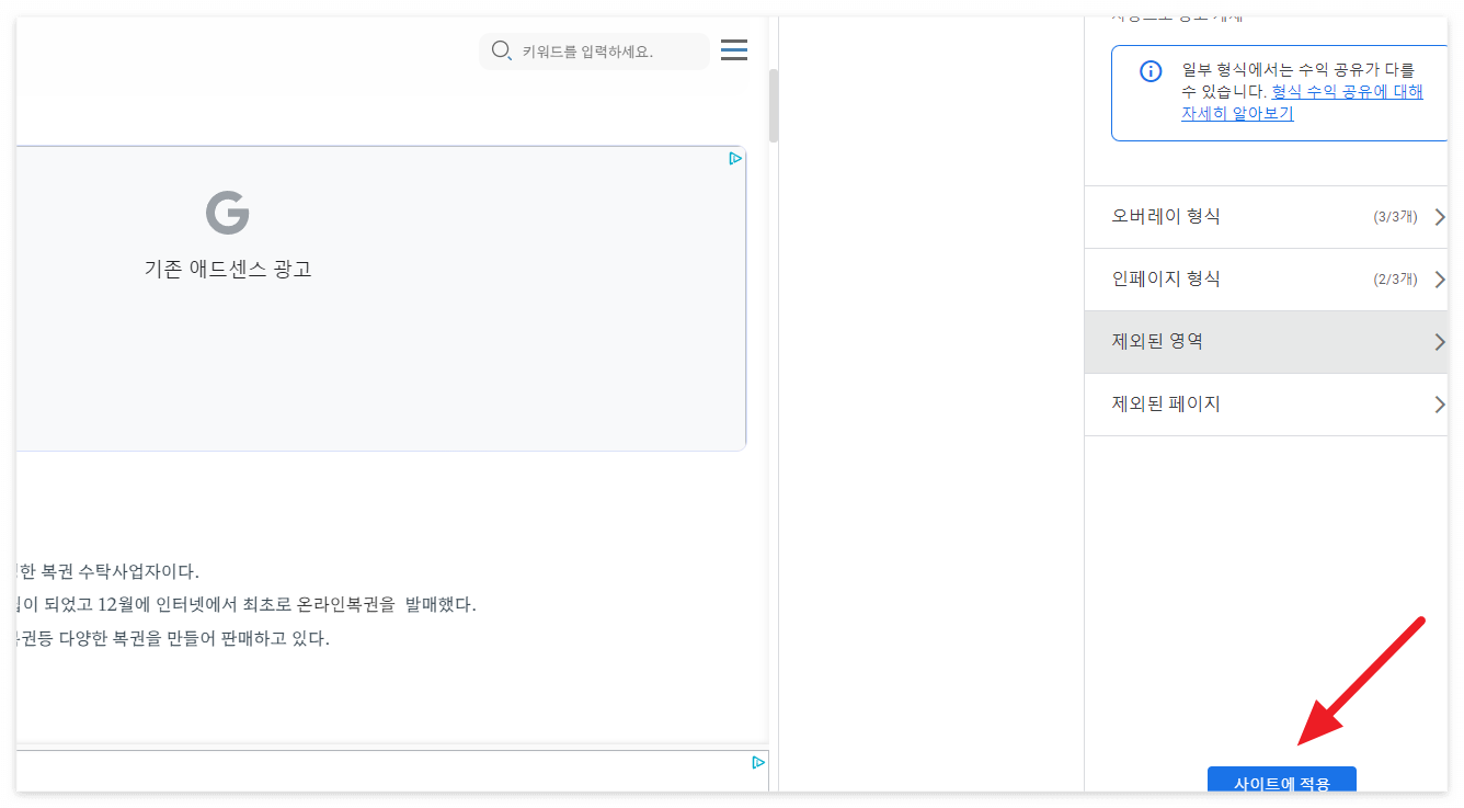 광고영역 설정이 끝났다면 사이트에 적용을 눌러 실제 사이트에 적용을 시킨다.