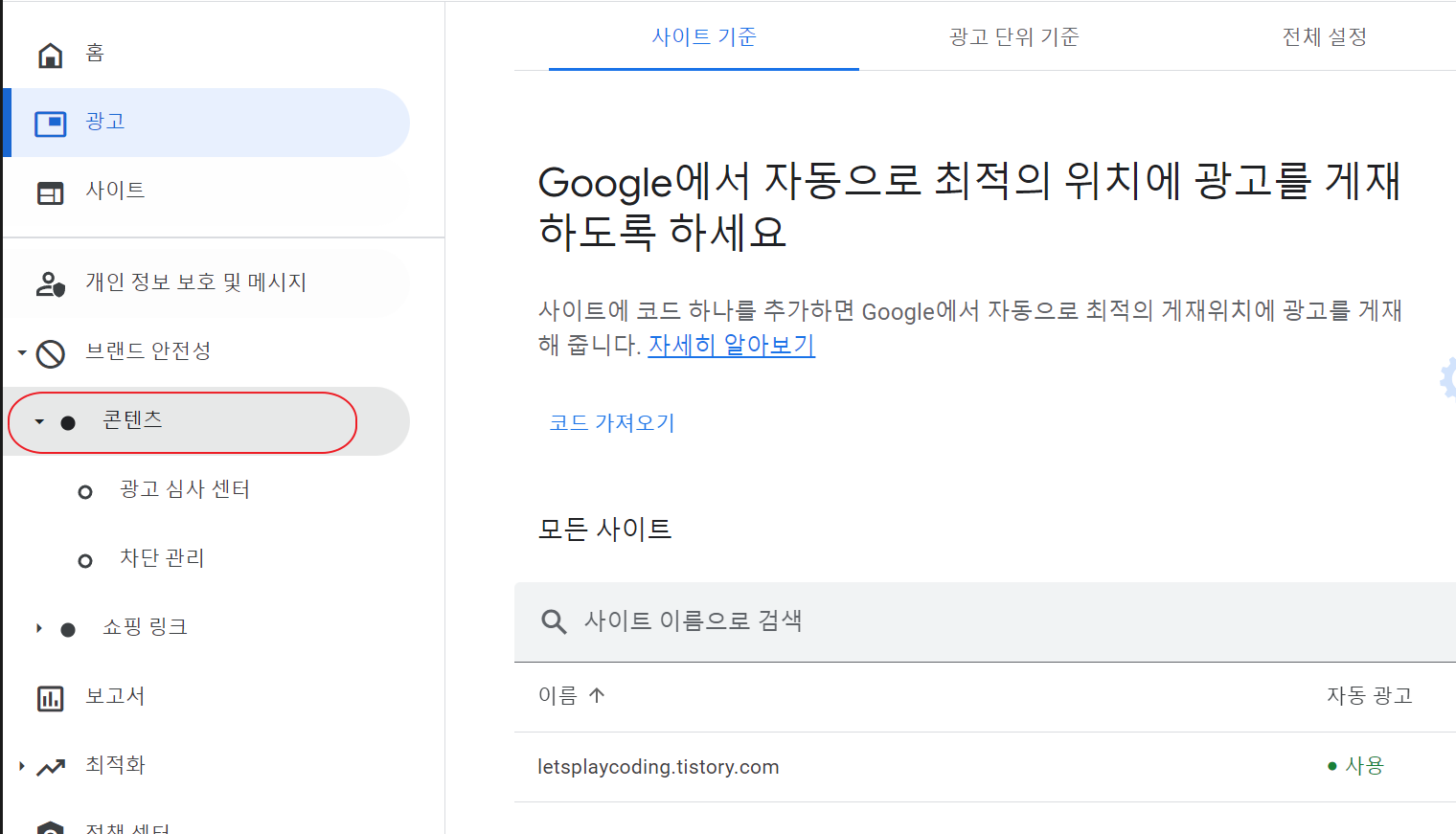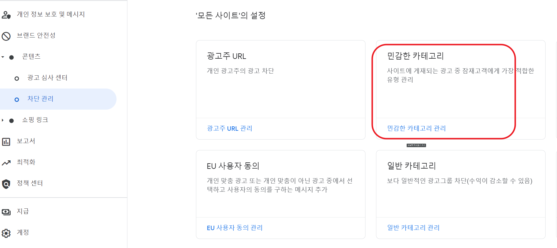 [콘텐츠]-[차단관리] 메뉴에서는 내 사이트에 적합한 광고가 설정이 되어 있는지를 확인할 수 있다.