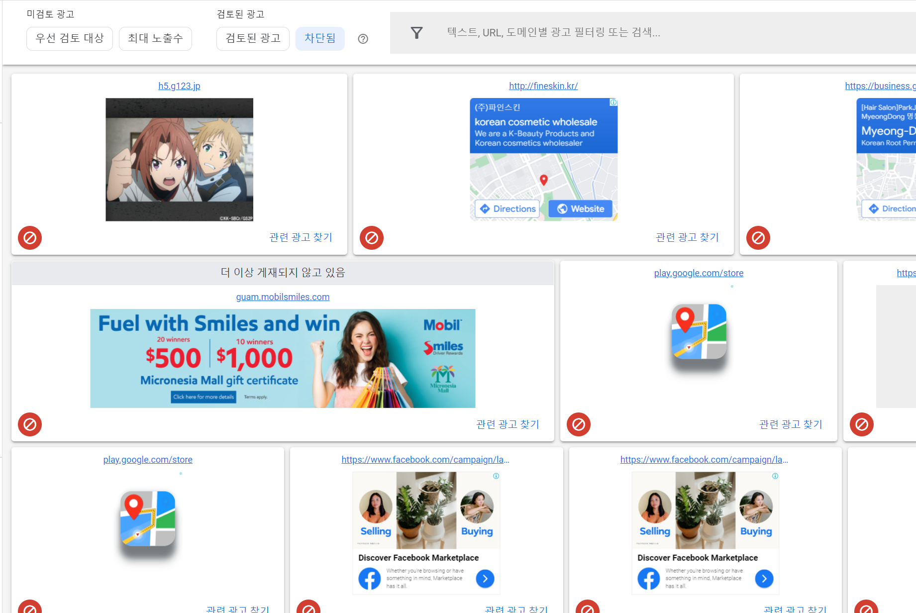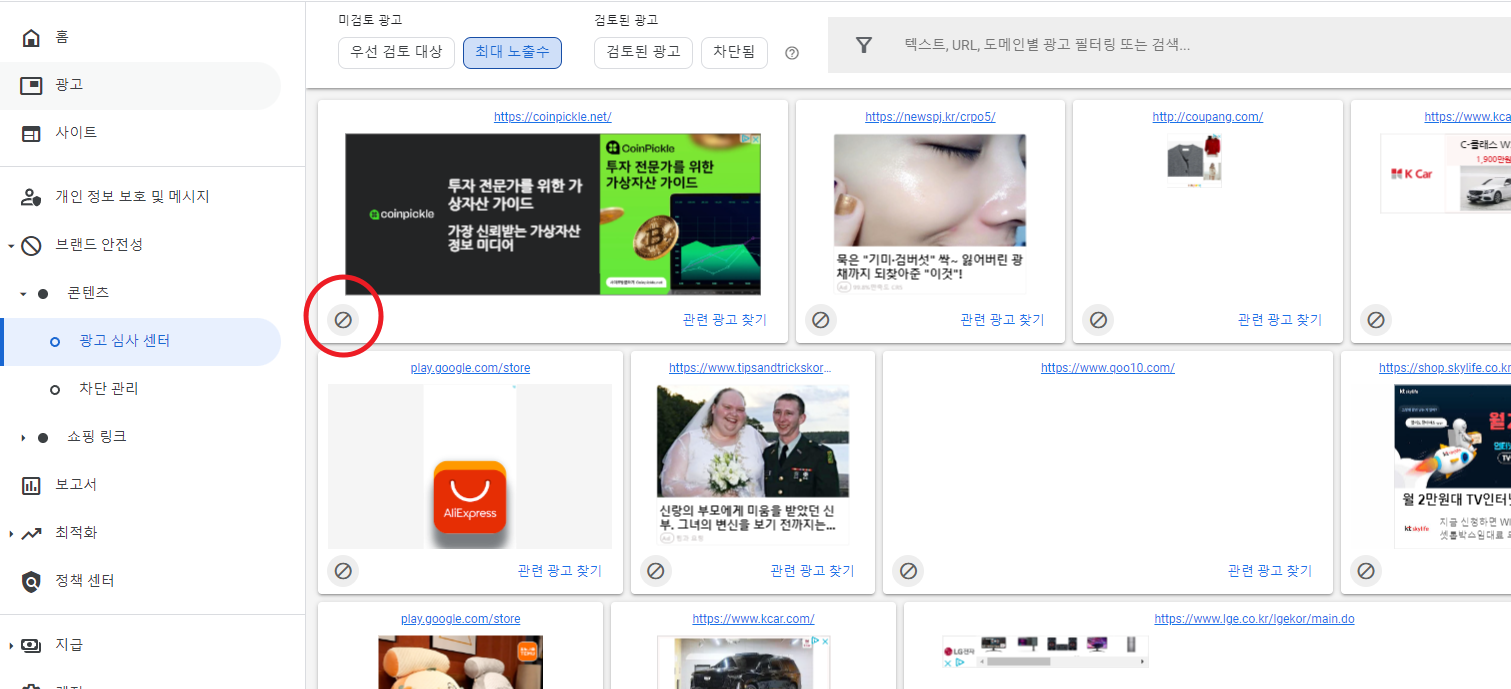 차단되었던 광고를 다시 해제 하려면 빨간색 금지 아이콘을 클릭하면 다시 노출되게 된다.