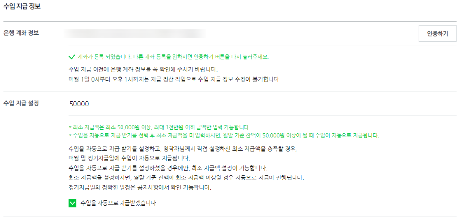 애드포스트로 발생한 수입은 지급 정보탭에 은행 계좌 정보를 입력하면 인출을 할 수 있다.