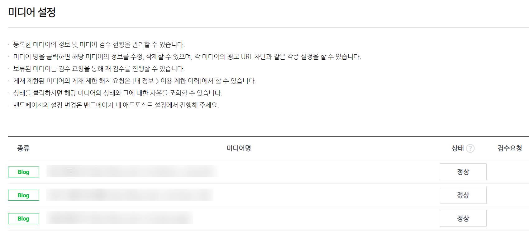 이용방법은 광고를 게재할 미디어(블로그,포스트, 밴드)를 선택하고 검수를 요청한후 승인이 될때까지 기다리면 된다.