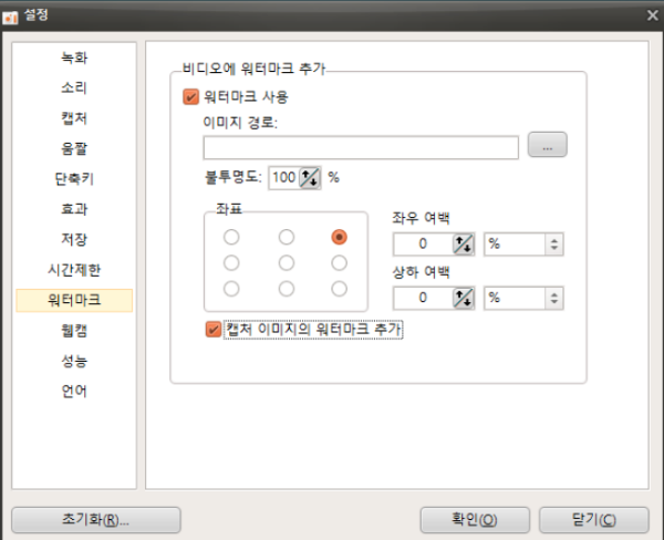 워터마크를 사용하고자 할 때는 워터마크 사용에 체크하고 이미지 경로를 눌러 워터마크 이미지를 등록해 줘야 한다.
