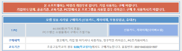 라이선스는 비영리 개인은 무료이며 기업이나 단체, 공공기관, 교육기관, pc방에서 사용 시에는 라이선스를 구매 후 이용을 해야 한다.
