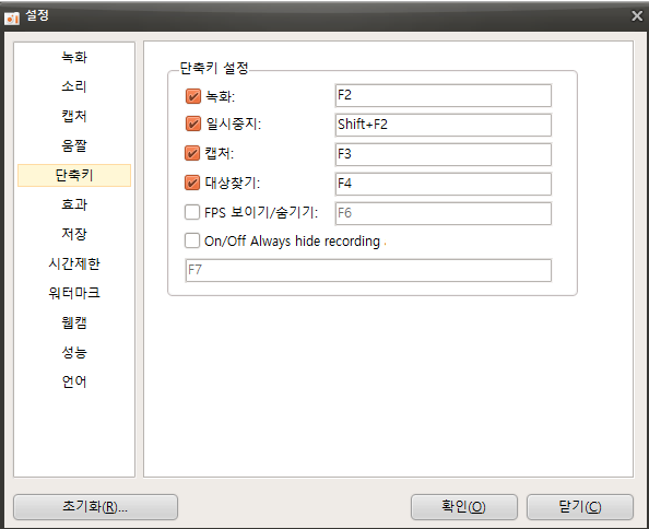 기본 설정은 녹화는 F2, 일시중지는 Shift+F2, 캡처는 F3, 대상 찾기는 F4, FPS수치 보이기는 F6으로 설정 되어 있다.