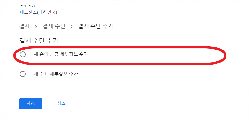 결제 수단 추가를 누르면 2개의 세부 정보추가 항목이 나오는데 새 은행 송금 세부 정보 추가를 클릭해 준다.