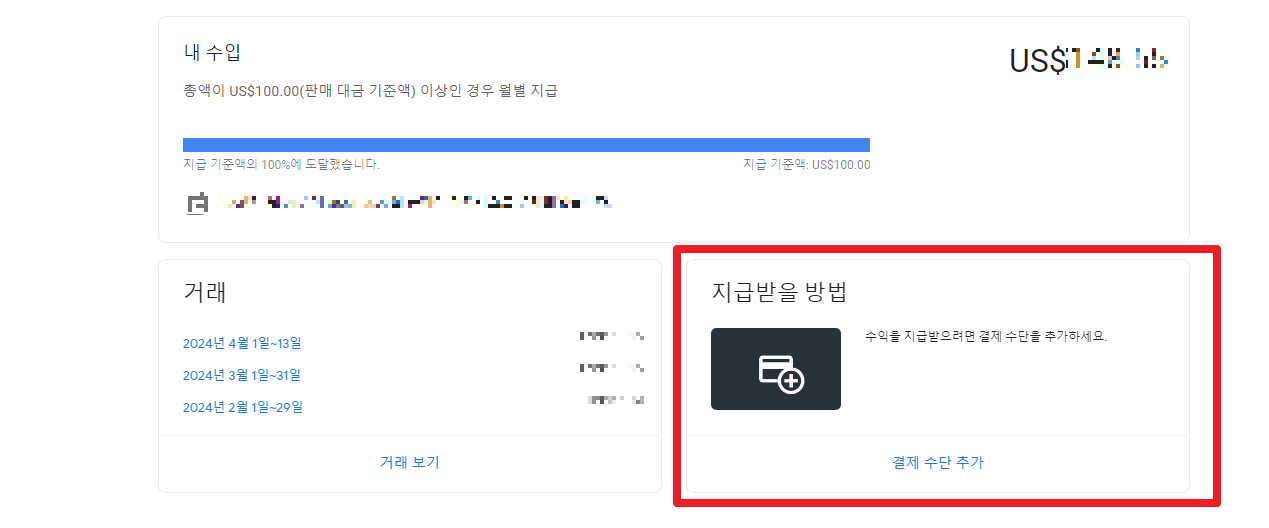 애드센스를 통해 광고수익 총액이 100달러에 이르면 월별로 내 수입을 은행 계좌로 지급받을 수 있다.