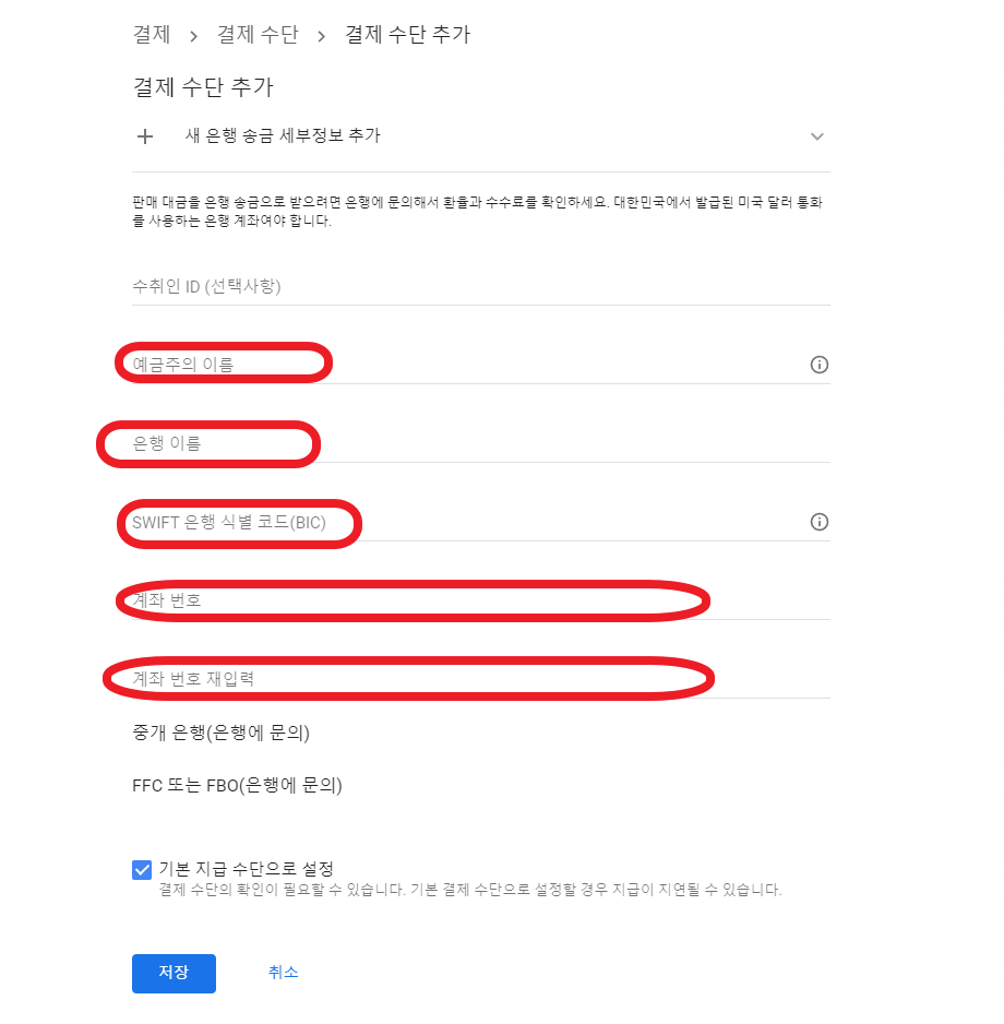 결제 수단 추가를 누르면 2개의 세부 정보추가 항목이 나오는데  새 은행 송금 세부 정보 추가를 클릭해 준다.