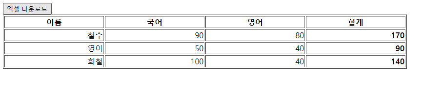 먼저 html table을 만든 후에 id값을 주고 다운로드 버튼을 누르면 테이블의 셀값을 읽어서 blob형식으로 파일저장을 한다.