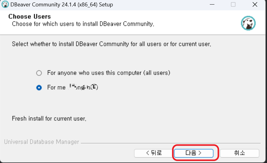 설치하고자 하는 모든 사람을 위해 설치하려면 위 라디오박스를 체크하고
